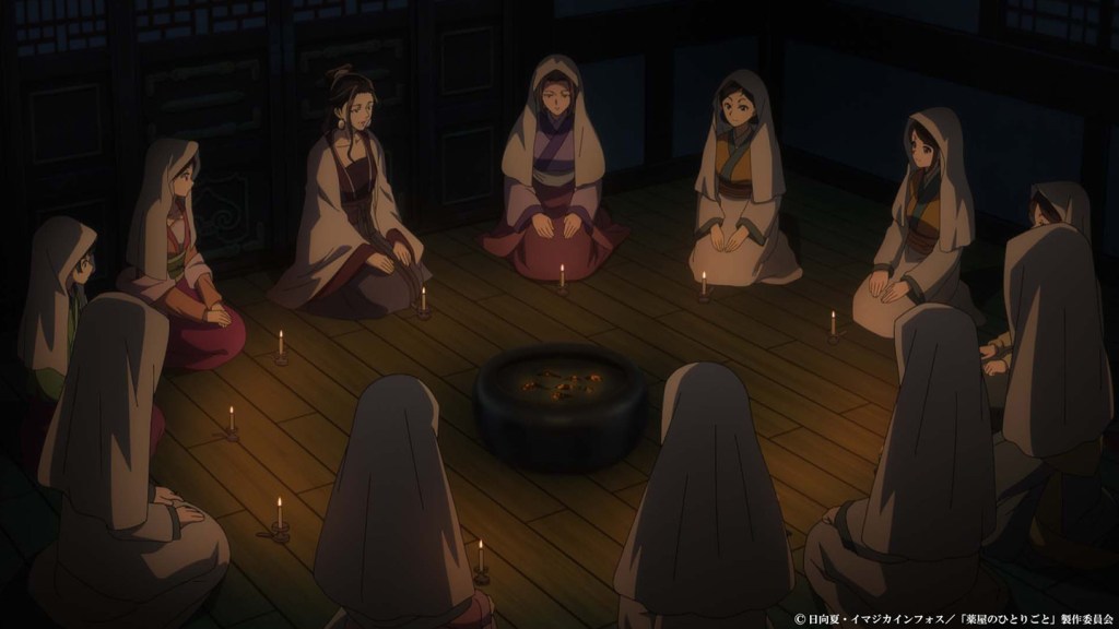 All this is precipitated by Yinghua cajoling Maomao into accompanying her to a night-time gathering of the palace ladies. As we have seen before, stuck inside the palace walls, there is little by way of entertainment for the palace ladies. And so this has the air of an (almost) clandestine midnight party scaring each other with ghost stories. The setting is perfect – an old room in a disused part of the palace, barely lit by a fire in the middle and the candle each attendee holds. Each woman taking it in turn to tell her story, blowing out her candle when done, with the growing darkness and increasing shadows adding to the spookiness of the endeavour as the night progresses.