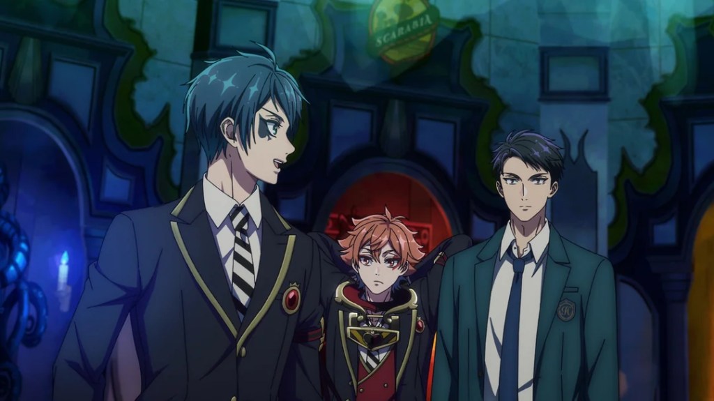 All this pretty much serves as an excuse to get everyone to the HeartsLabyul dorm, and later the cafeteria, where we get to meet third years Cater and Trey. and further expand our understanding of the Night Raven College lore. Of course the houses are all typified by a single character type/field of magic. You have the disciplinarians of HeartsLabyul, the jocks of Savanaclaw, the scheming dealmakers of Octavinelle (who naturally manage the school’s student-run cafe), the fortune-tellers of Scarabia, the appearance obsessed potioneers of Pomefiore, the socially challenged techies of Ignihyde and the skilled mages of Diasomnia. The source material is a videogame after all so perhaps a deeper characterization is too much to expect, especially given the breadth of characters. Or this is setting up a storyline for everyone to realize they are more than just the stereotypical personas associated with their houses.